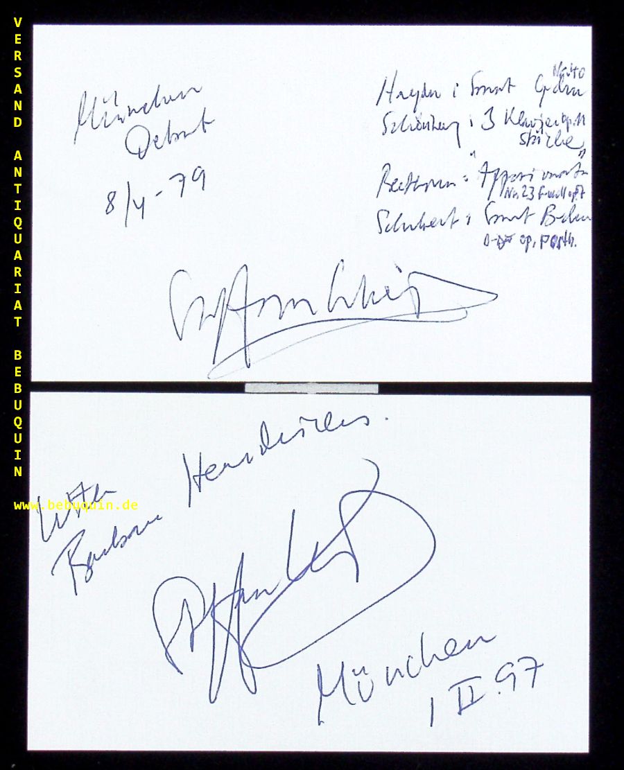 SCHEJA, Staffen (Pianist): 2 eigenhändig signierte und datierte Autogrammkarten: mit umfangreicher eigenhändiger Programmbeschreibung.. München (Philharmonie), 1.2.1997. 8 x 12,5 cm. 2 Karteikarten.
