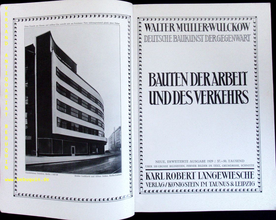 ARCHITEKTUR.– MÜLLER-WULCKOW, Walter: Bauten der Arbeit und des Verkehrs aus deutscher Gegenwart. 37.– 50. Tsd. Königstein (Langewiesche), 1929. 4°. 119 S. mit 100 Bildtafeln sowie Texrtabb, Grundrisse und Schnitte. ill. OKart. NaV.