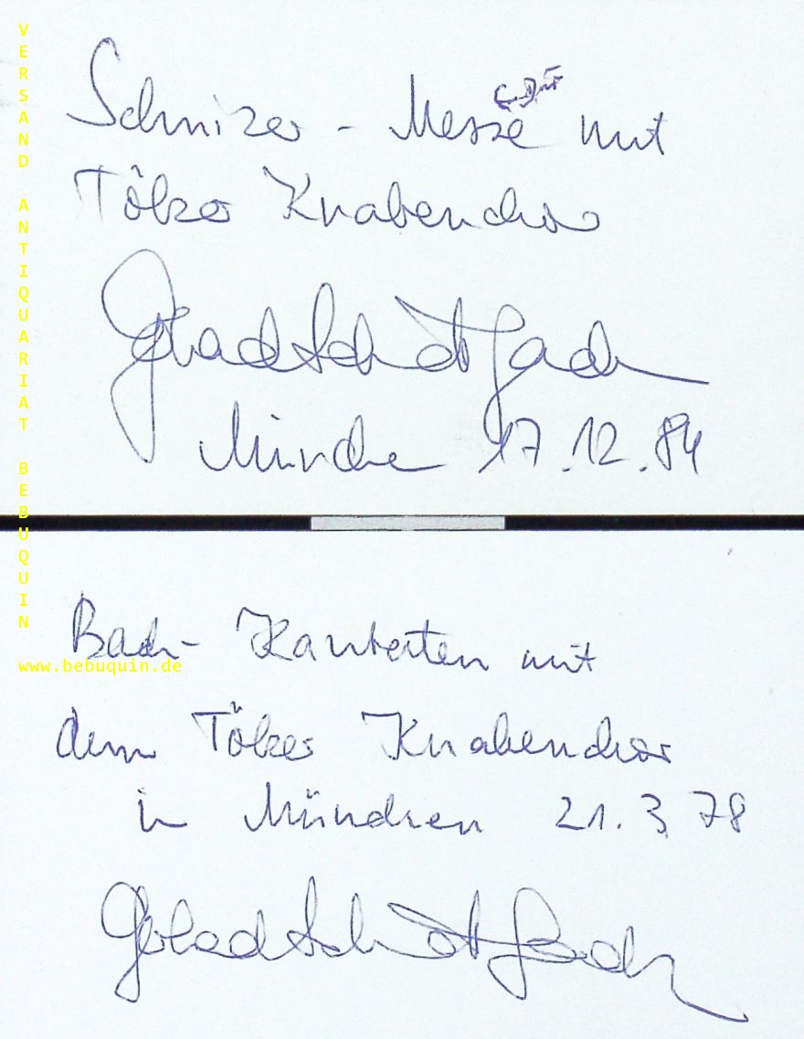 SCHMIDT-GADEN, Grerhard (Dirigent): 2 eigenhändig signierte und datierte Autogrammkarten. München, 1978 + 1984. 8 x 12,5 cm. 2 Karteikarten.