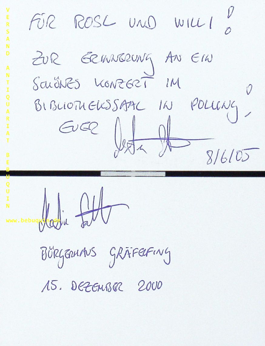 SCHMITT, Martin (Pianist): 2 eigenhändig signierte und datierte Autogrammkarten. Polling und Gräfelfiing, 2000 + 2005. 8 x 12,5 cm. 2 Karteikarten. Martin Schmitt (* 15. Januar 1968 in München) ist ein deutscher Pianist, Sänger, Entertainer, Komponist und Texter. (Wikipedia)
