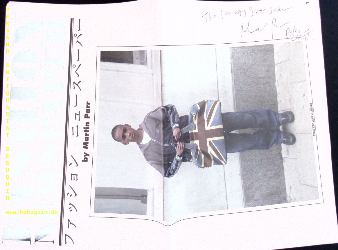 MODE.– PARR, Martin: Fashion Newspaper. Tokyo (Magnum), 2007. 35 x 42 cm. 64 S. fast durchgehend mit großformatigen Fotoabbildungen auf pinkfarbenem Papier. ill. OBr. mittig gefaltet. EA mit einem eigenhändigen voll signierten und datierten verfasservermerk: „The First copy I have seen.″