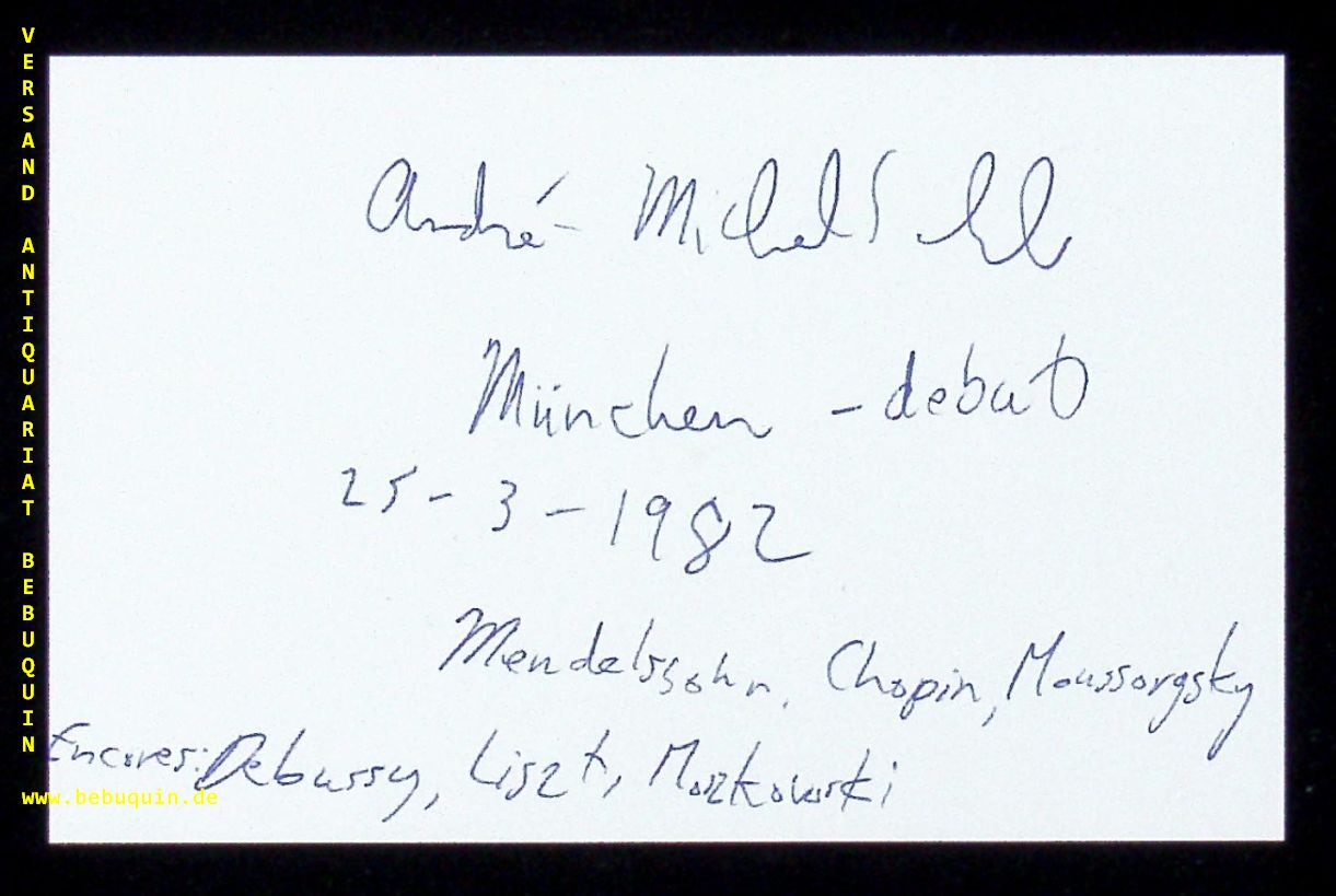 SCHUB, André-Micherl (Pianist): eigenhändig signierte und datierte Autogrammkarte. München (Philharmonie), 25.3.1982. 8 x 12,5 cm. Karteikarte. André-Michel Schub (* 26. Dezember 1952 in Paris) ist ein US-amerikanischer Pianist und Musikpädagoge französischer Herkunft. (Wikipedia)