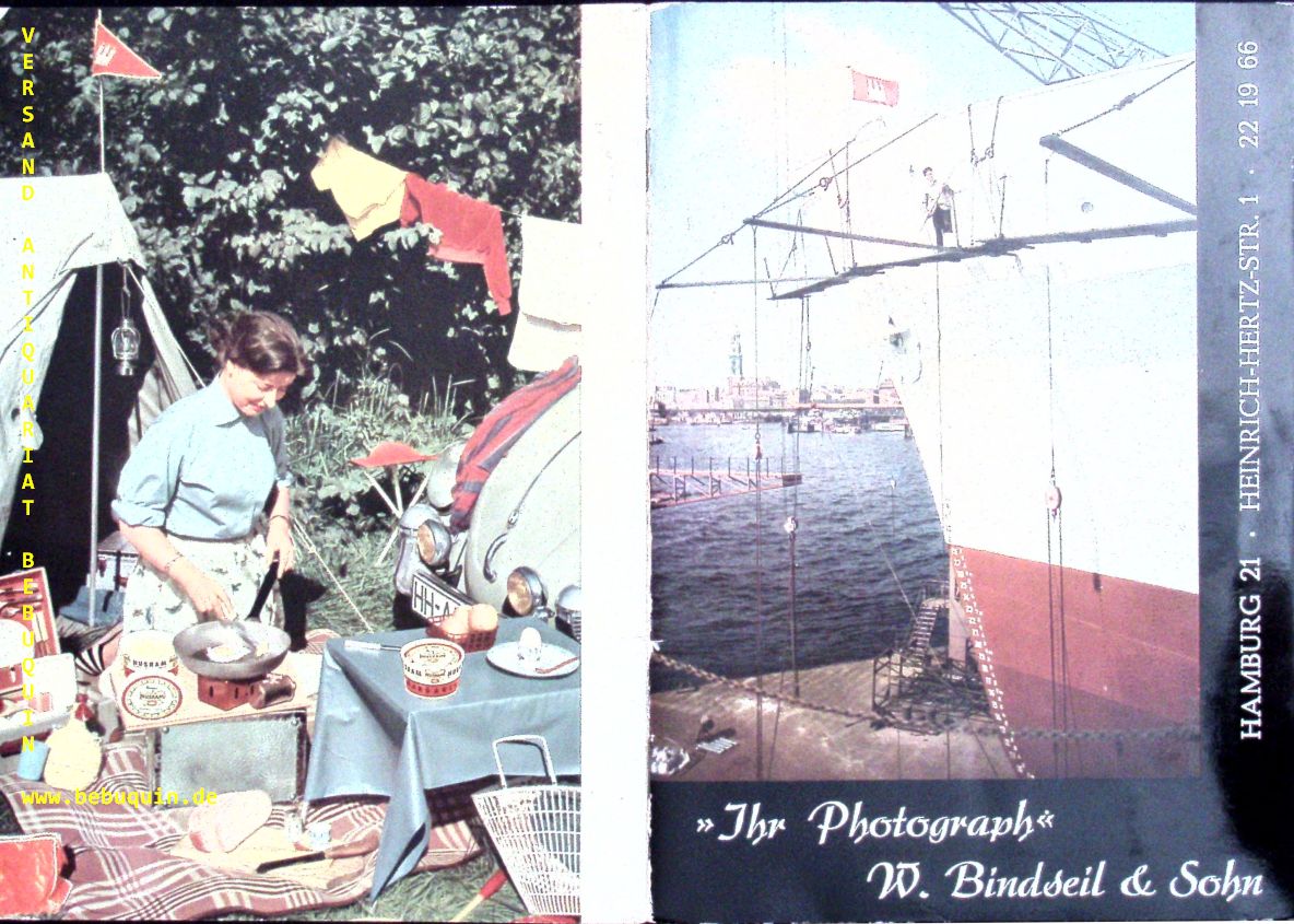 TECHNIK.– BINDESEIL & SOHN „Ihr Photograph“. Ein halbes jahrhundert im Dienste der Photographie. Hamburg, 1957. 6 Bl. mit zahlr. teils farb., teils mont. Bildern. farb. ill. OKart. gutes Ex. EA. seltenes Zeitdokument.