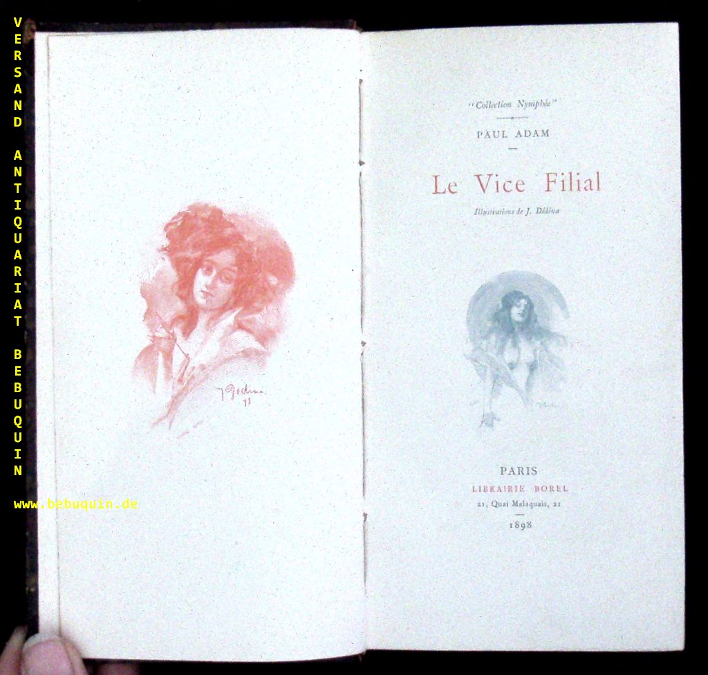 ADAM, Paul: Le vice filial. Paris (Borel), 1898. kl. 8°. 242 S. mit Illustrationen von J. Dédina. HLdr der Zeit mit goldgeprägtem Rücken. gutes Ex. = Collection Nymphée. EA.