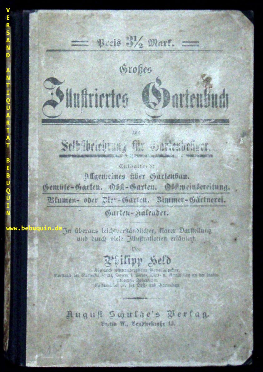 BOTANIK.– HELD, Philipp: Illustriertes Gartenbuch. Zur Selbstbelehrung dür Gartenbesitzer. 4. Aufl. Berlin (Schultzes), 1895. XVI, 368, 8 S. mit zahlr. Abb. ill. OHLn. etwas gebräunt.