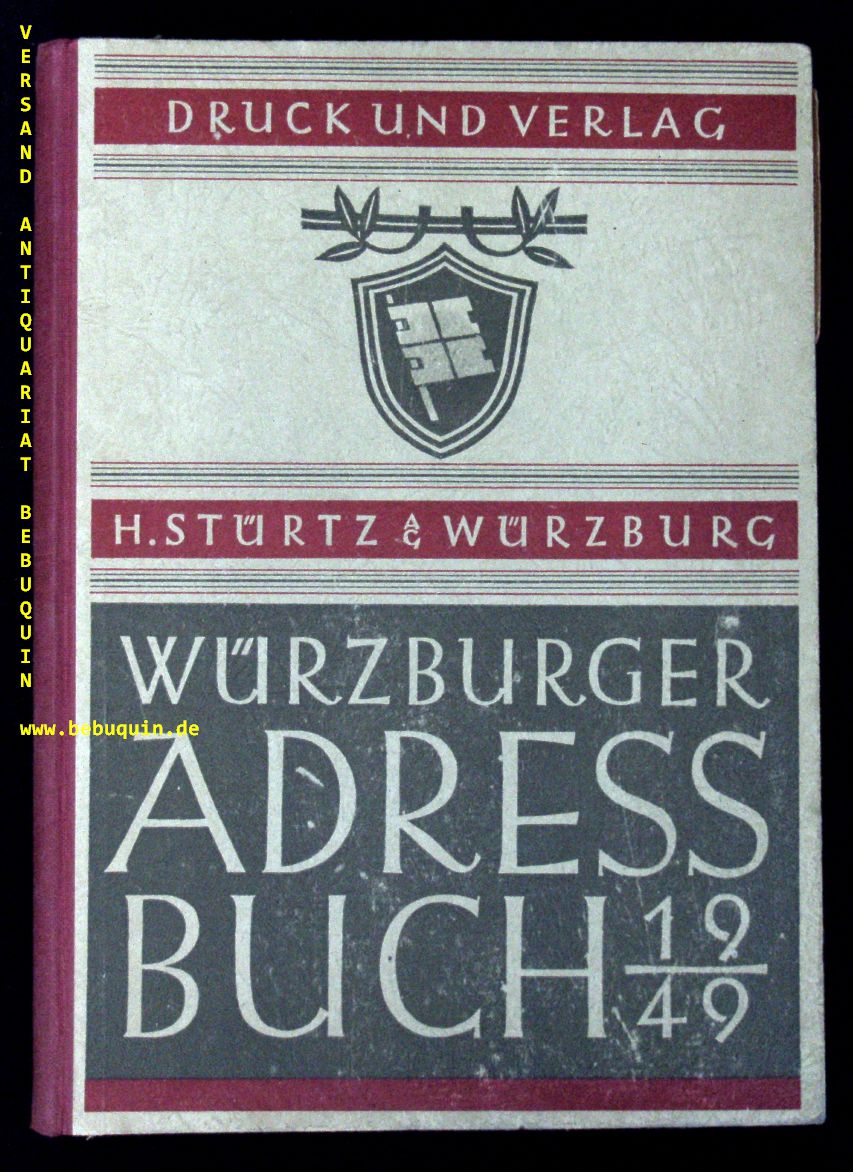 WÜRZBURG.– WÜRZBURGER ADRESSBUCH 1949.– 47. Jahrgang. Nach dem Stand vom 15. September 1948. Würzburg (Stürtz), 1948. 4°. 7 Bl., VIII, 343 S. mit zahlr. Abb. ill. OHLn. Deckel nur leicht berieben, sonst tadellos.