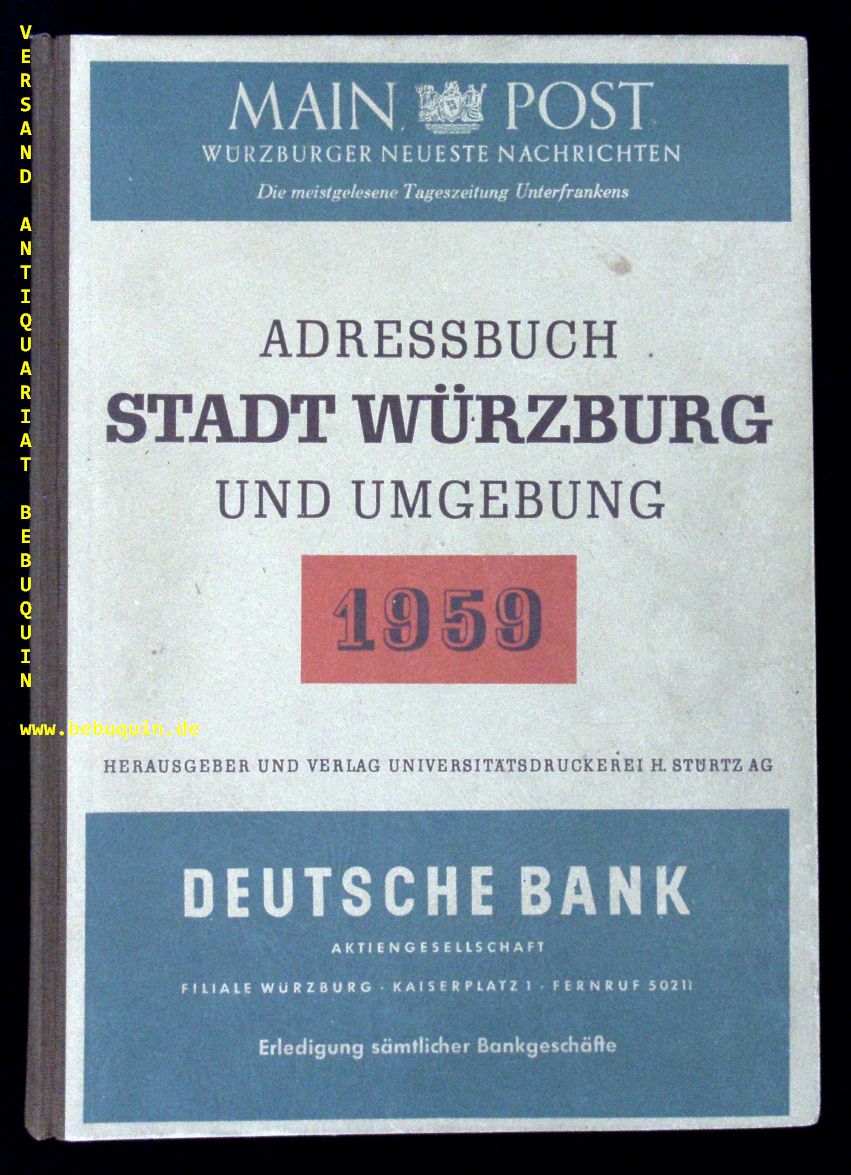 WÜRZBURG.– ADRESSBUCH STADT WÜRZBURG UND UMGEBUNG 1959.– 57. Jahrgang. Mit den Nachbargemeinden Gerbrunn, Höchberg, Lengfeld, Randersacker, Rimpar, Rottendorf, Thüngersheim, Unterdürrbach, Veitshöchheim, Versbach und Zell am Main. Nach dem Stand vom 1. Oktober 1958. Würzburg (Stürtz), 1958. 4°. 11 Bl. 626 (2) S. mit zahlr. Abb. und Zwischenkartons. ill. OHLn. ohne den Stadtplan, sonst tadellos.