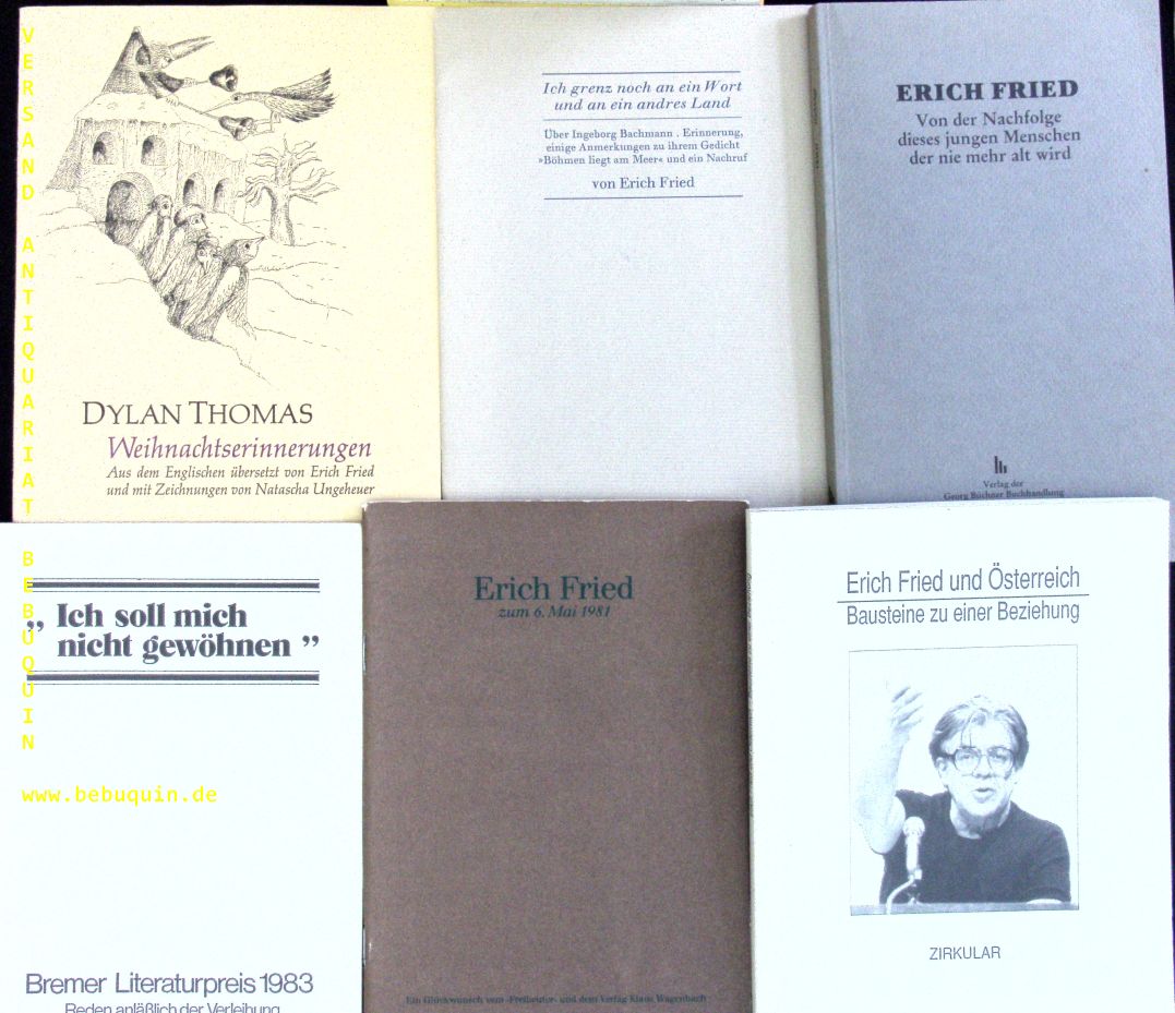 FRIED, Erich: Großes Konvolut mit über 30 Titeln. Dabei 18 Erstausgaben: WG² 15, 18, 22, 27, 51, 53, 54, 62, 69, 73, 75, 76, 81, 84, 91, 94, 99, 101. insgesamt 33 Bände. Berlin (Wagenbach u.a.), 1963 ff. zusammen mehrere tausend Seiten. OKart. sowie OPb. sowie OLn. überwiegend sehr gut erhalten. Umfangreiche Sammlung.