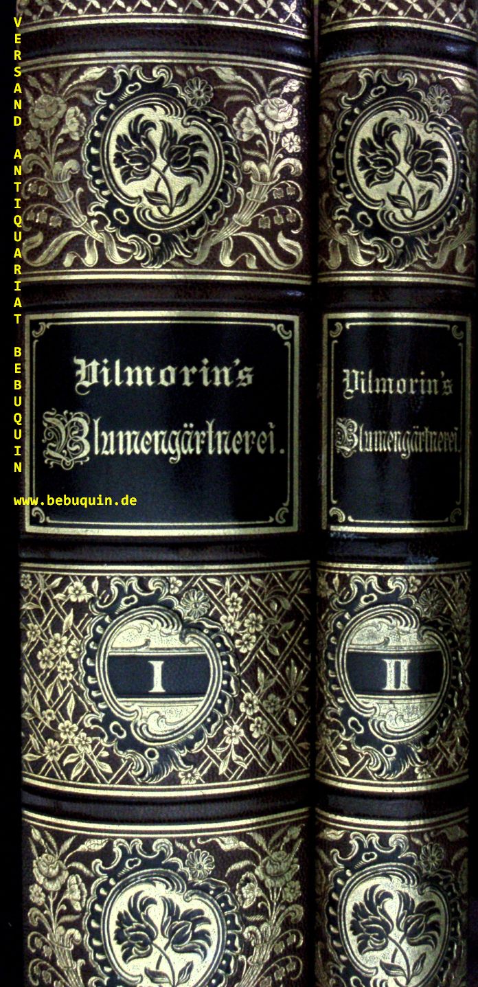 BOTANIK.– VILMORIN, Pierre Louis François Levèque de: Vilmorin’s Blumengärtnerei. Beschreibung, Kultur und Verwendung des gesamten Pflanzenmaterials für deutsche Gärten. 3., neubearb. Aufl. 2 Bände. Berlin (Parey), 1896. VIII, 1264 S. mit 1272 Textabb. und 244 S. + 400 bunten Blumenbildern auf 100 Farbendrucktafel. reich verziertes OHLdr. mit goldgeprägtem Rücken. sehr feines Ex. Die dritte neubearbeite Auflage ist ein Buch mit botanischen Beschreibungen, das von dem deutschen Botaniker und Meteorologen Andreas Voss in den Jahren 1894-1896 in 50 Teilen herausgegeben wurde, mit dem Name von Vilmorins Blumengärtnerei Beschreibung, Kultur und Verwendung des Gesamten Pflanzenmaterials für den Deutschen Garten. Andreas Voss spezialisierte sich auf den Gartenbau und war zusammen mit August E. Siebert (1854-1923) deutscher Redakteur der dritten Auflage des Vilmoriner Leitfadens für die Blumengärtnerei, Vilmorins Blumengärtnerei.