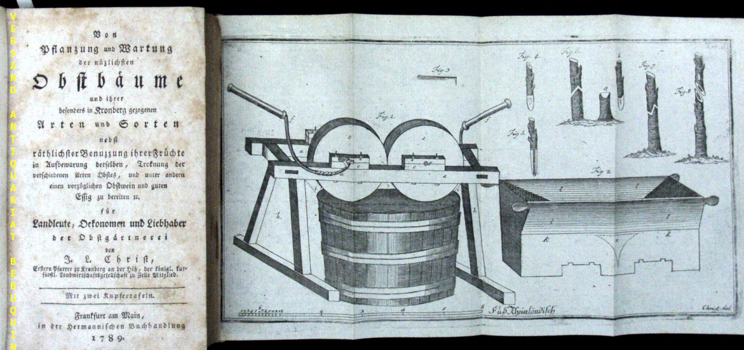 POMOLOGIE.– CHRIST, Johann Ludwig: Von Pflanzung und Wartung der nüzlichsten Obstbäume und ihrer besonders in Kronenberg gezogenen Arten und Sorten. Nebst räthlichster Benuzzung ihrer Früchte in Aufbewahrung derselben, Troknung der verschiedenen Arten Obstes, und unter andern einen vorzüglichen Obstwein und guten Essig zu bereiten für Landleute, Oekonomen und Liebhaber der Obstgärtnerei. 2 Bände in 1 Bd. Frankfurt am Main (Hermann), 1789 – 1891. 8°. XXVIII, 500, 312 S. mit 2 gefalteten Kupfertafeln. HLdr der Zeit auf 6 Bünden. Papier altersgerecht gebräunt, gutes Ex.