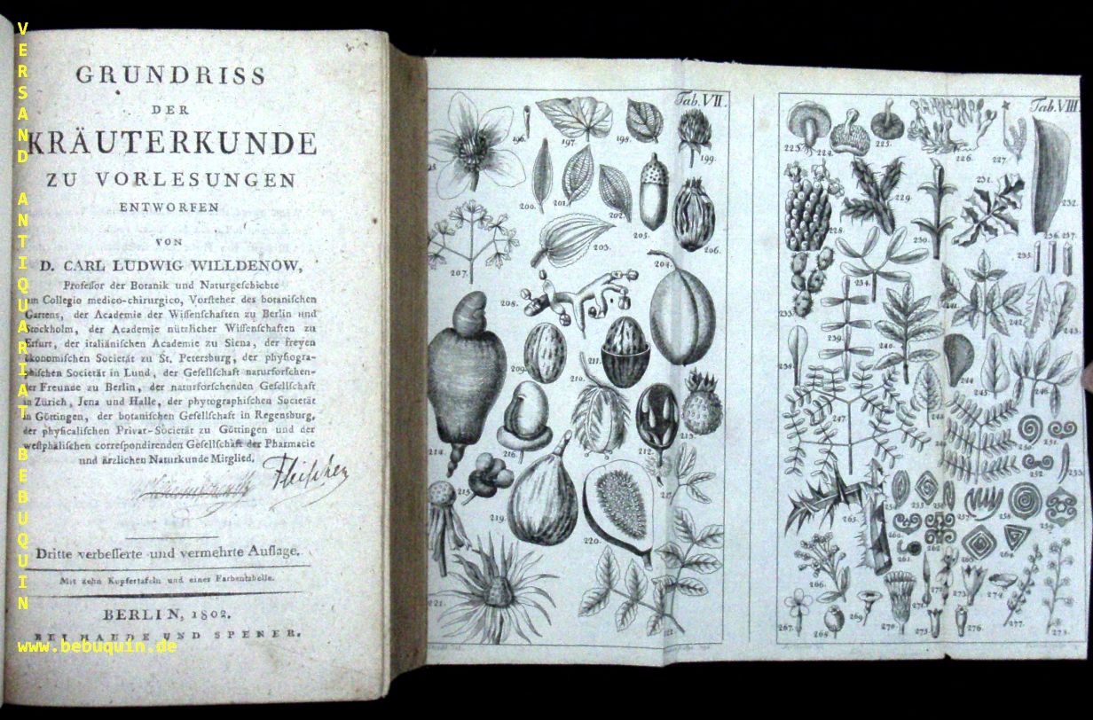BOTANIK.– WILLDENOW, Karl Ludwig: Grundriss Der Kräuterkunde. 3. verbesserte und vermehrte Auflage. Berlin, Haude und Spener, 1802. 1 Bl., 644 S. + 10 Kupfertafeln und eine Farbentabelle. neuer HLn mit goldgeprägtem Rücken. NaT, feines Ex.