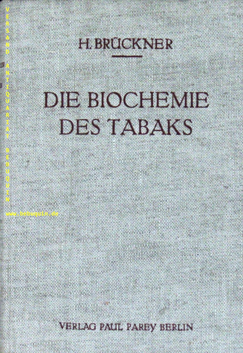 TABAK.– BRÜCKNER, Hermann: Die Biochemie des Tabaks und der Tabakverarbeitung mit besonderer Berücksichtigung der chemischen Qualitätsbestimmung. Zugleich ein Beispiel der natürlichen Veränderung und methodischen Untersuchung pflanzlicher Genuss-, Heil- und Futtermittel bei ihrer Gewinnung, Verarbeitung und Aufbewahrung. Berlin (Parey), 1936. Gr. 8°. XII, 446 (2) S. mit zahlr. graph. Darst. OLn. StaV. EA.