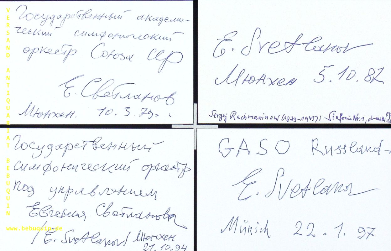SVETLANOW, Jewgenij (Dirigent): 8 eigenhändig signierte und datierte Autogrammkarten mit zumeist längeren eigenhändigen Programmbeschreibungen. München (Herkulessaal), 1967 – 1997. 20 x 21 cm. 8 Karteikarten.