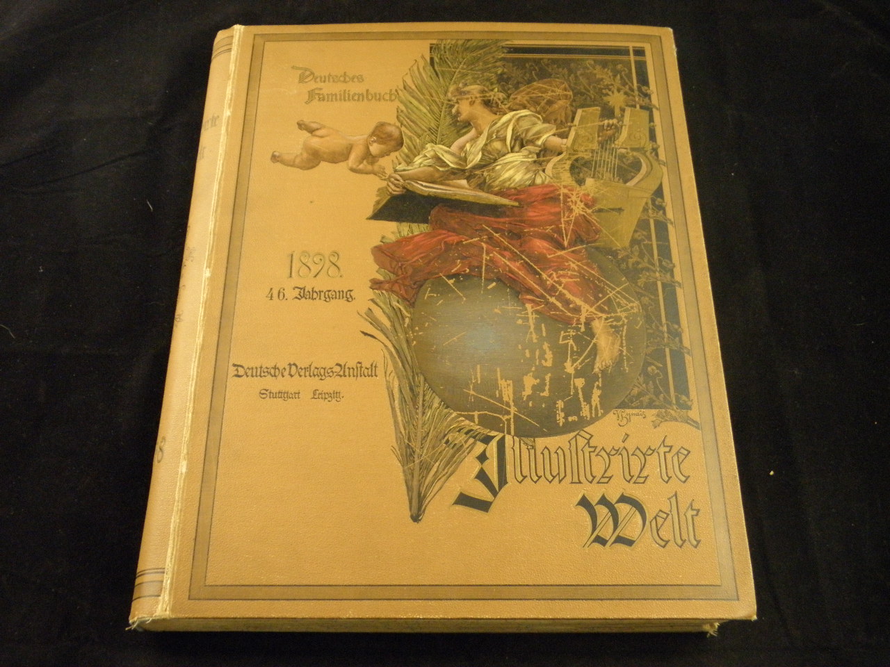 DIE ILLUSTRIRTE WELT.– Deutsches Famiienbuch. 1898. Blätter aus Natur und Leben, Wissenschaft und Kunst. 52 Nummern in 1 Bd. Stuttgart (Hallberger), 1898. Fol. VI, 680 S. mit zahlr. Illustrationen. farb. ill. OLn. eine Seite lose, sonst kaum gelockert, gutes Ex. = 46. Jahrgang. Mit teils farb. Bilder von Langohrs Famiiengeschichte, Stefansdom, Rocka Mountains, Andree, Lettenbach, Adrian Bubenberg, Blücher, Turnfest in Schaffhausen, Hochwasser in Schlesien, Thüringer Glasindustrie, Ansichtskarten aus Afrika, Fürst Bismarck, Schule in Konstantinopel, englische Militärradfahrer etc sowie Texten von Joh. Bahr etc.