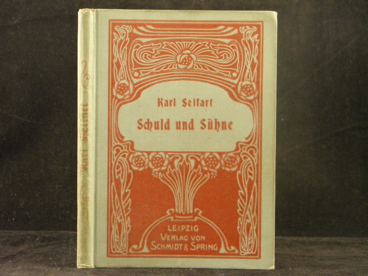 SEIFART, Karl: Schuld undSühne. Stuttgart (Schmidt & Spring), (1889). 12°. 89 S. mit 4 Stahlstichen. ill. OLn mit Jugendstilornamentik. gut erhalten. EA. Klotz 6745/14.