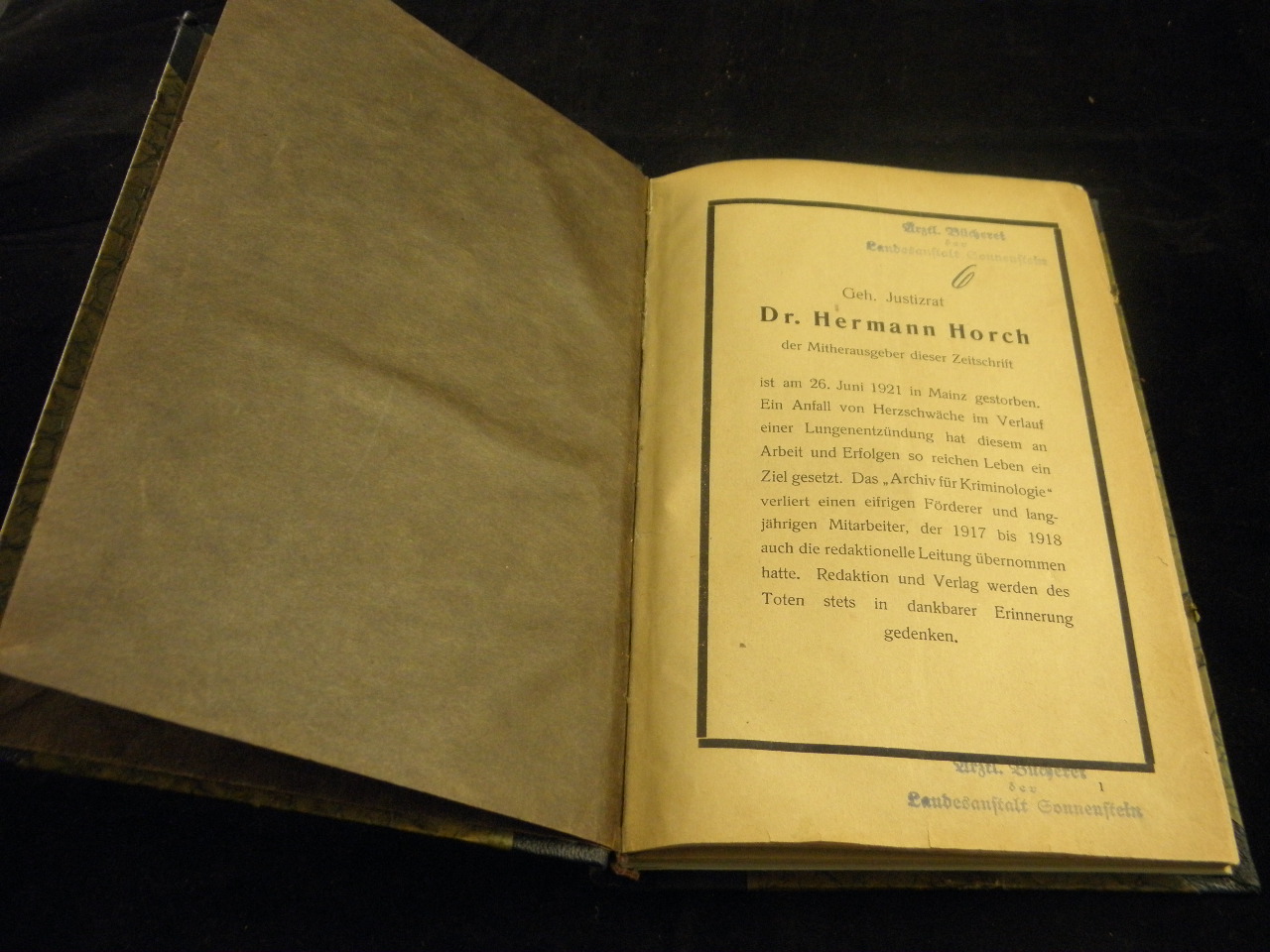 KRIMINALISTIK.– BENDER: Zwei merkwürdige Fälle von falschem Verdacht der Brandstiftung. Angebunden: Bertold Heymann: Zur geplanten Verstaatlichung der württembergischen Polizeiverwaltung. Angebunden von Hermann Zingerle: Zur gerichsärztlichen Beurteilung kindlicher Beschuldigungen. 2 Artikel in 1 Bd. Leipzig (Hirschfeld), 1921. ca 160 S. HLn der Zeit. Rücken mit Bibliotheksmarken.
