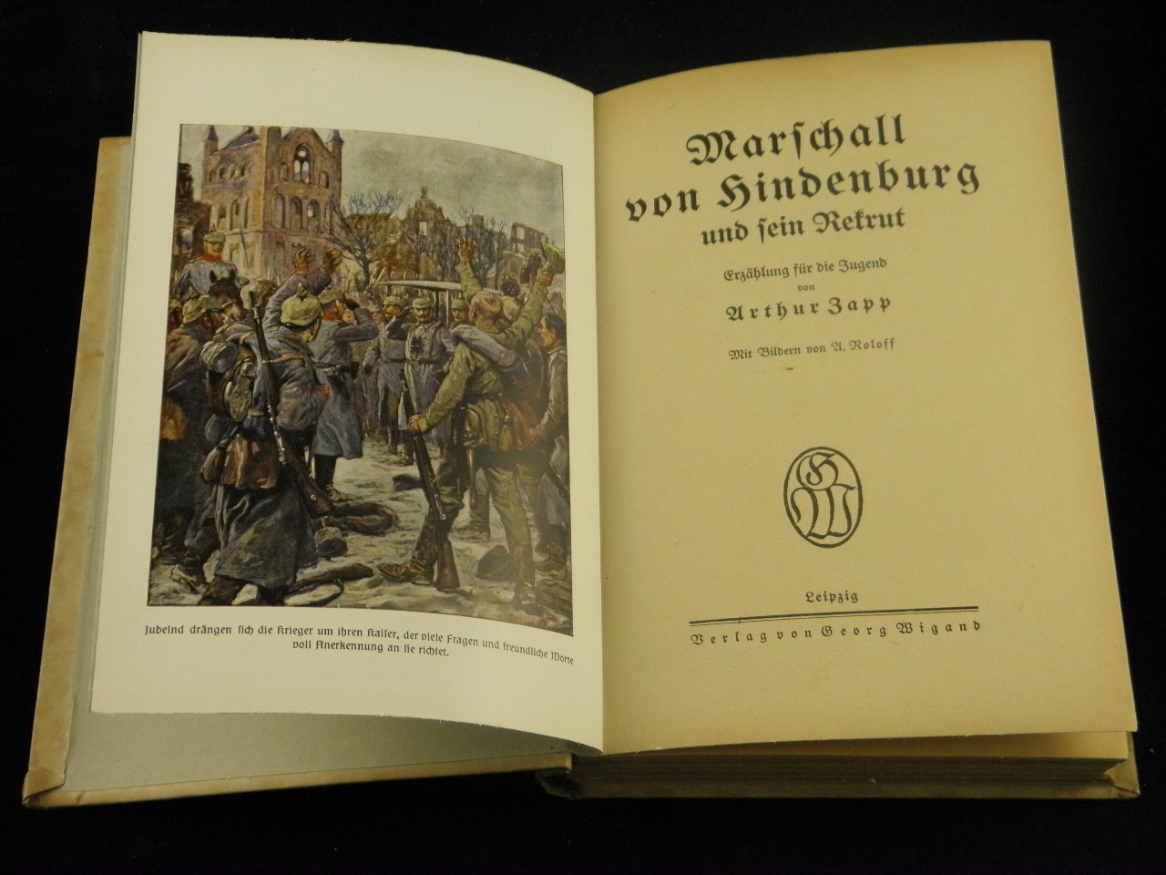 ZAPP, Arthur: Marschall von Hindenburg und sein Rekrut. Leipzig (Wigand), ca 1920. 258 (2) S. + zahlr. teils farb. Bildtafeln von A. Roloff. far. ill. OPb. gutes Exemplar. EA.