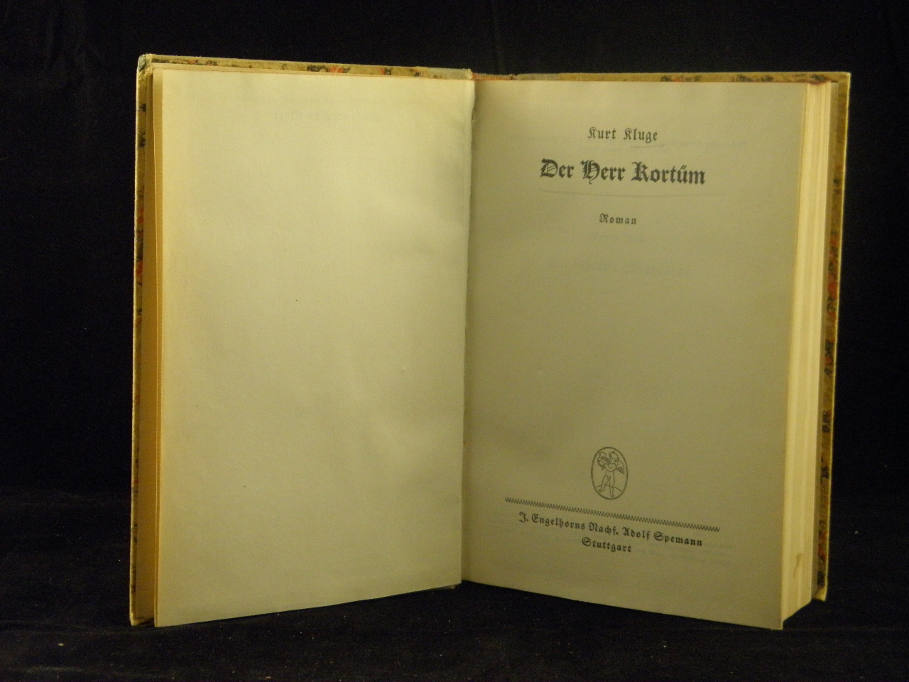 KLUGE, Kurt: Der Herr Kortüm. Stuttgart (Engelhorn), 1938. 745 S. HPrgt der Zeit. Schnitt mit kleinem Fleck. EA WG² 13.