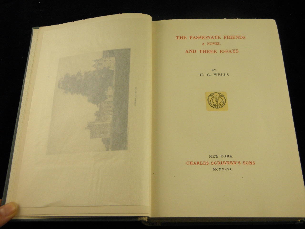 WELLS, H.G.: The passioante Friends. A novel an d three essays. New York (Scribner), 1926. Gr. 8°. 4 Bl. 444 S. mit einem Kameraportrait als Frontispiz by Hugh Cecil. OHLn. unaufgeschnitten. = Atlantic Edition, Vol., XVIII. Nr. 933 von 1050 handschriftlich nummerierten Ex. dieser Ausgabe.