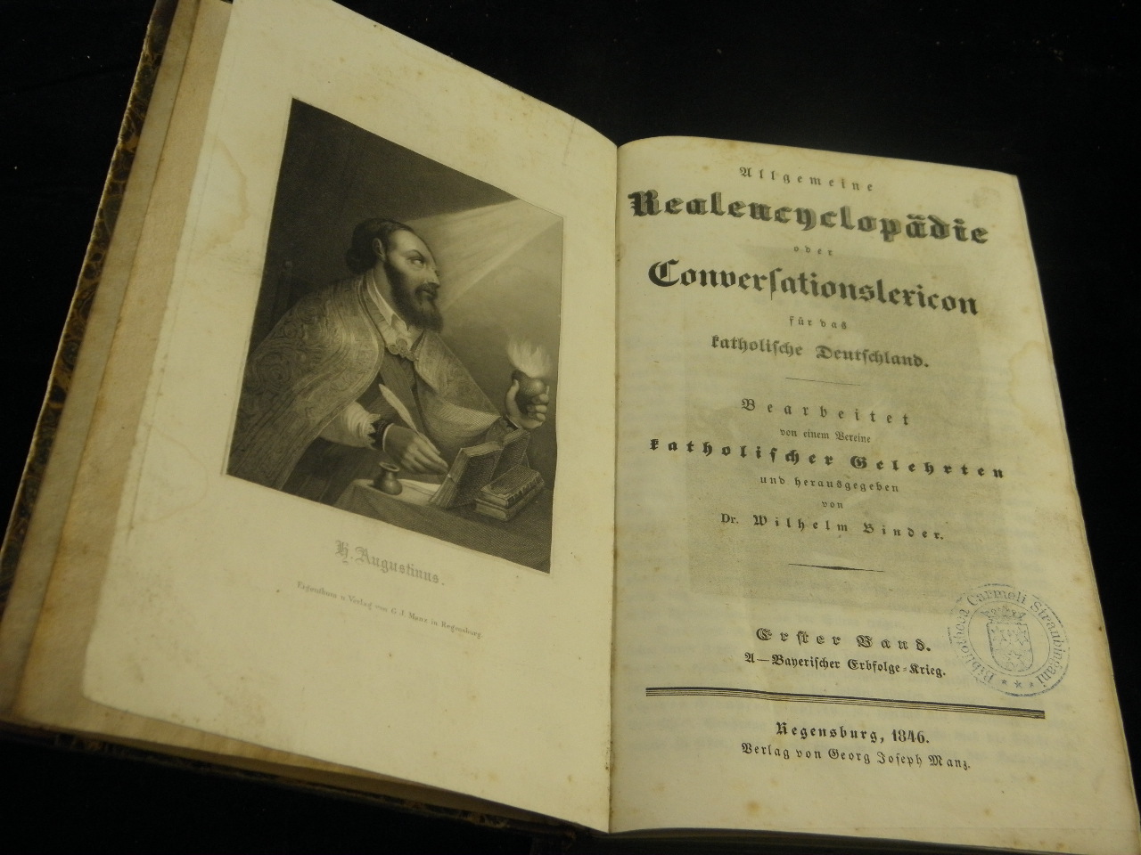 BINDER, Wilhelm: (Hrsg.) Allgemeine Realencyclopädie oder Conversationslexicon für das katholische Deutschland. – Erster Band: A – Bayrisch. Bd. 1 (von 12). Regensburg (Manz), 1846. Gr. 8°. 1136 S. mit fein gestochenem Stahlstich als Frontispiz. Hldr der Zeit mit goldgeprägtem Rücken. Rücken und Kanten etwas berieben, innen kaum gebräunt, gutes Ex.