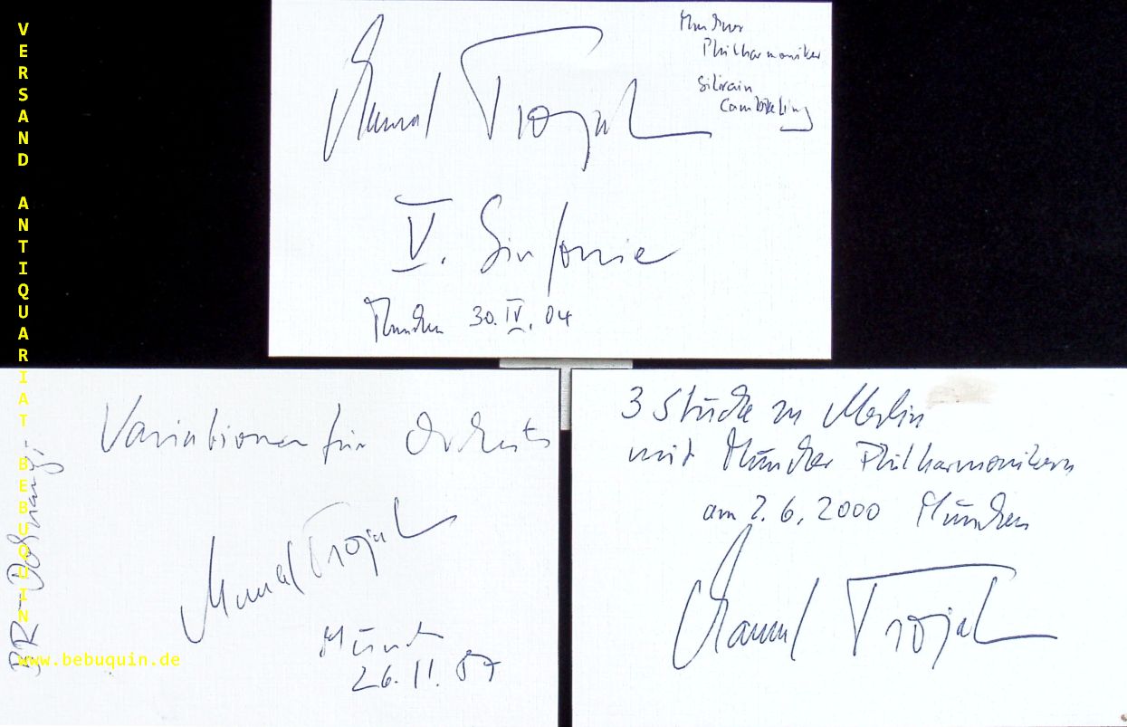 TROJAHN, Manfred (Komponist): 3 eigenhändig signierte und datierte Autogrammkarten. München (Philharmonie), 1987 – 2004. 8 x 12,5 cm. 3 Karteikarte. Manfred Trojahn (* 22. Oktober 1949 in Cremlingen, Niedersachsen) ist ein deutscher Komponist, Dirigent und Essayist. (Wikipedia)