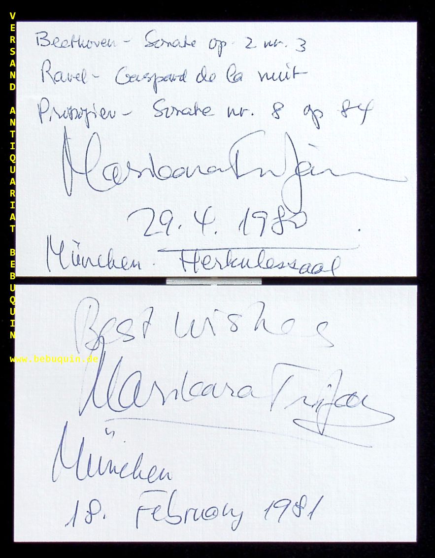 TRIFAN, Marioara (Pianistin): 2 eigenhändig signierte und datierte Autogrammkarten. München (Herkulessaal), 1980 + 1981. 8 x 12,5 cm. 2 Karteikarten. Marioara Trifan (* 8. März 1950 in Los Angeles) ist eine US-amerikanische Pianistin, Dirigentin und Hochschullehrerin. (Wikipedia)