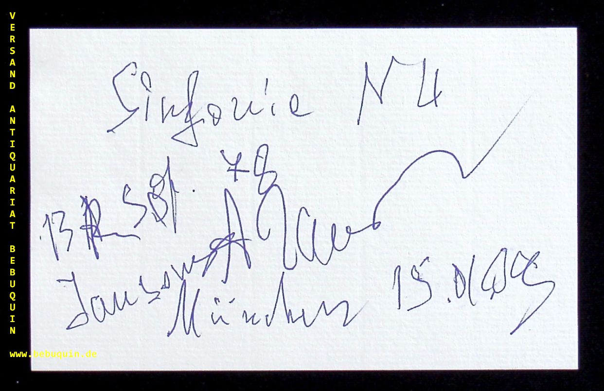 TSCHAIKOWSKY, Alexander (Komponist): eigenhändig signierte und datierte Autogrammkarte. München (Herkulessaal), 15.1.1978 (?). 8 x 12,5 cm. Karteikarte. Alexander Wladimirowitsch Tschaikowski (* 19. Februar 1946 in Moskau, Sowjetunion) ist ein russischer Komponist, Hochschullehrer und Pianist. Er ist ein Neffe des Komponisten Boris Tschaikowski (1925–1996). Mit Pjotr Iljitsch Tschaikowski (1840–1893) verbinden ihn keine verwandtschaftlichen Beziehungen (Wikipedia)
