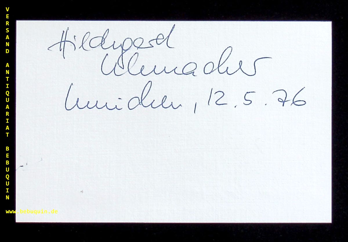 UHRMACHER, Hildegard (Sopran): eigenhändig signierte und datierte Autogrammkarte. München (Philharmonie), 12.5.1976. 8 x 12,5 cm. Karteikarte. Hildegard Uhrmacher, verheiratete Hildegard Kronstein-Uhrmacher, (* 15. Dezember 1939 in Mönchengladbach) ist eine deutsche Opernsängerin (Sopran). (Wikipedia)