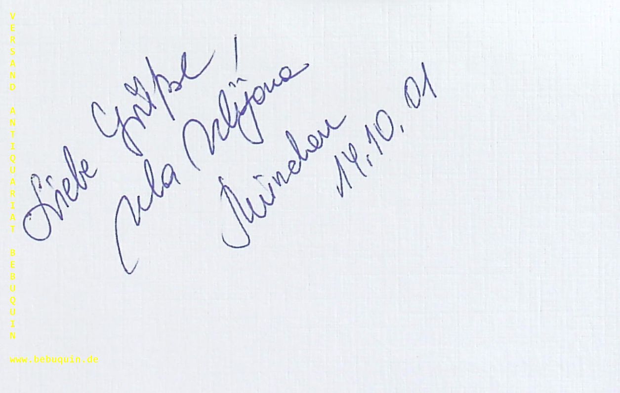 ULIJONA, Ula (Bratschistin): eigenhändig signierte und datierte Autogrammkarte. München (Philharmonie), 14.10.2001. 8 x 12,5 cm. Karteikarte. Ula Ulijona wurde 1974 in Vilnius, Litauen, geboren und studierte zunächst an der dortigen Musikakademie bei Petras Radzevicius sowie an der Hochschule für Musik Basel bei Hatto Beyerle. Anschließend absolvierte sie ein Aufbaustudium bei Tabea Zimmermann an der Musikhochschule „Hanns Eisler“ in Berlin. (Wikipedia)