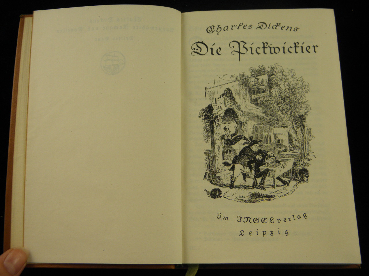 DICKENS, Charles: Die Pickwickier. D.v. Leo Feld. Leipzig (Insel), (1910). 1010 (2) S. mit zahlr abb. hellbraunes OLdr mit reicher Goldprägung von E.R. Weiß. Rücken leicht geblichen, gutes Ex. = Ausgewählte Romane und Novellen, Bd. 3. 1. und einzige Auflage dieser Lederausgabe. Sorkowski 382.