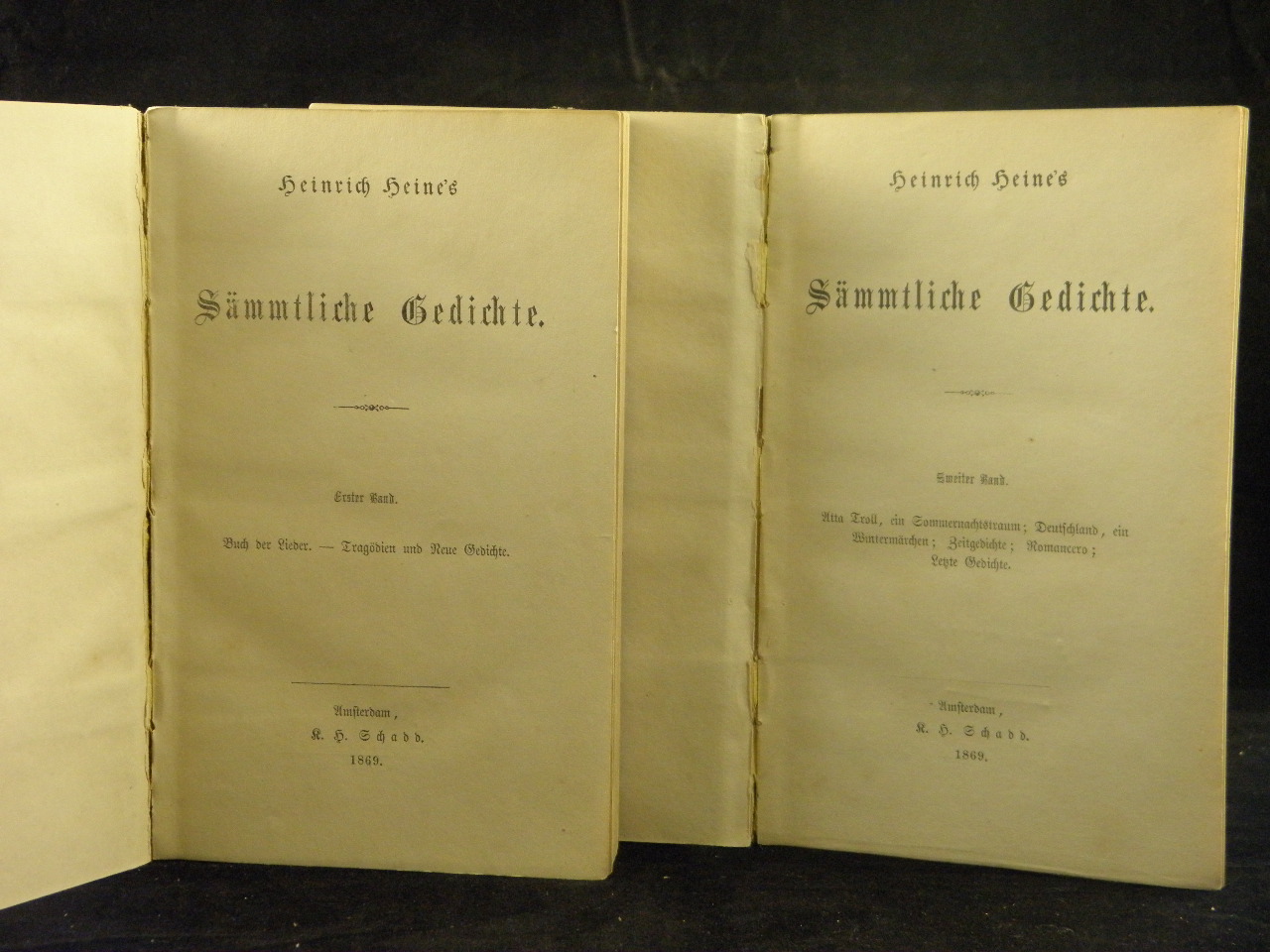 HEINE, Heinrich: Sämmtliche Gedichte. 1. + 2. Bd. Amsterdam (R. H. Schadd), 1869. kl. 8°. X, 389, VII, 401 S. Hldr der Zeit mit Papierrückenschildern. StaV, Gelenke kaum gelockert, insgesamt gut erhalten.