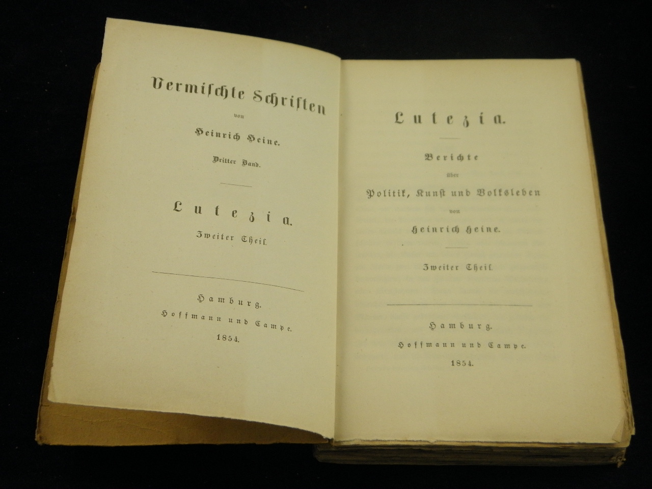HEINE, Heinrich: Lutezia. Berichte über Politik, Kunst und Volksleben. 2. Theil. Gedruckt bei Heinrich Hotop, Kassel. Hamburg (Hoffmann & Campe), 1854. kl. 8°. 310 (2) S. schlichter Interimseinband. Kanten unbeschnitten, sonst gut. = Vermischte Schriften, Bd. 3. EA. WG² 27; Wilhelm / Galley 570.