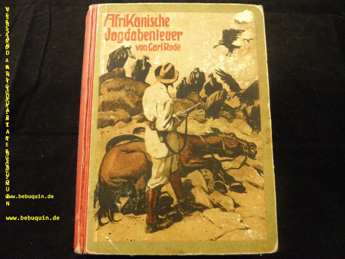RODE, Karl: Afrikanische Jagdabenteuer. Ernstes und Heiteres, wie ich’s erlebt habe. Stuttgart (Levy & Müller), ca 1905. 236 (4) S. mit zahlr. Bildtafeln und Textabb. von Rudolf Braun. farb. ill. OHLn. Kanten etwas berieben, Rückdeckel angeschmutzt, StaT, insgesamt ordentlich. seltene EA nicht bei Klotz.