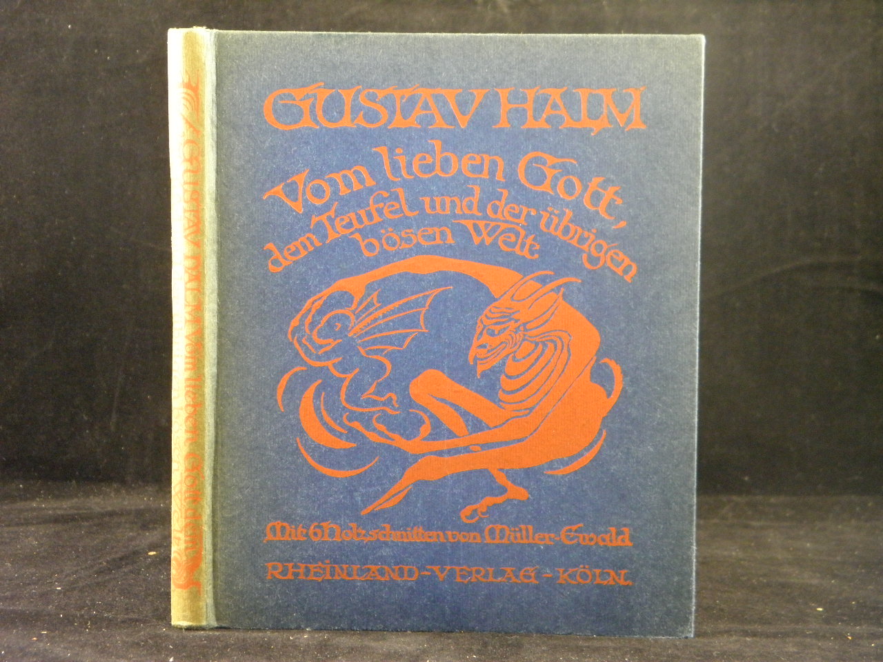 MÜLLER-EWALD.– HALM, Gustav: Vom lieben Gott, dem Teufel und der übrigen bösen Welt. Köln (Rheinland), 1921. kl. 8°. 110 S. mit 6 Original-Holzschnitten von Müller-Ewald. farb. illustr. OPb. Rückehn geblichen, sonst gutes Ex. EA.