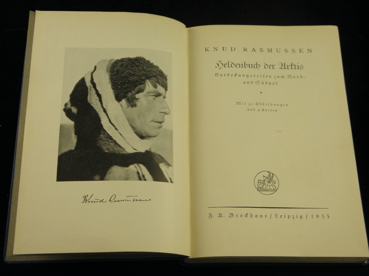 POLARGEBIETE.– RASMUSSEN, Knud: Heldenbuch der Arktis. Entdeckungsreisen zum Nord- und Südpol. D.v. Theodor Geiger. Leipzig (Brockhaus), 1933. Gr. 8°. 318 S. mit 52 Abb. + 4 Karten. Ln mit aufgesetztem ODeckel. dt. EA.