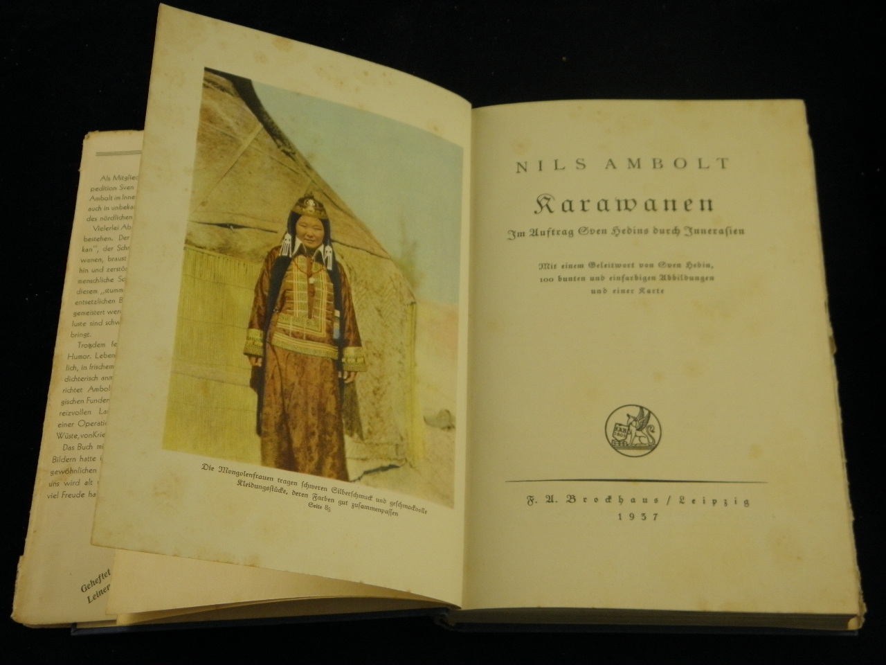 ASIEN.– AMBOLT, Nils: Karawanen. Im Auftrag Sven Hedins durch Innerasien. Leipzig (Brockhaus), 1937. Gr. 8°. 191 S. + 100 z.T. farb. Bildern auf Tafeln sowie 1 Karte. ill. OLn. mit OUmschl. teils stockfleckig, Umschlag etwas lädiert. EA.