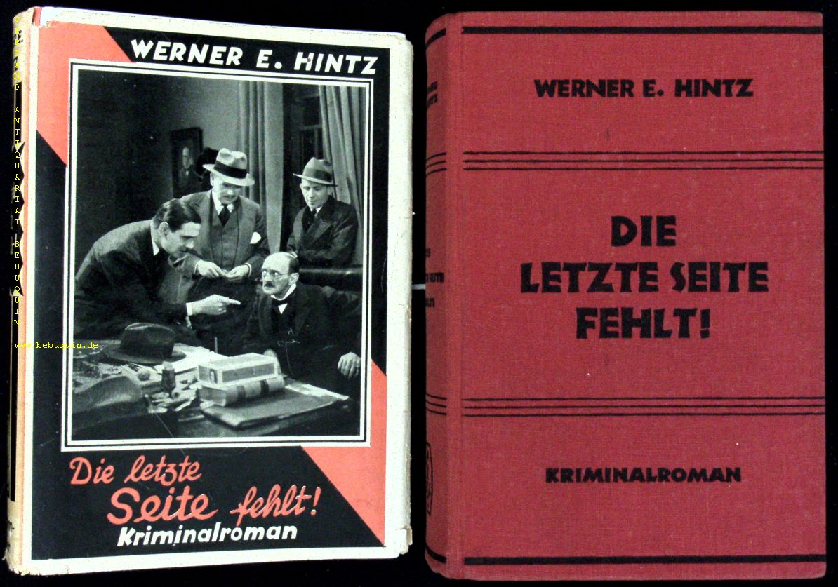 HINTZ, Werner E.: Die letzte Seite fehlt. Kriminalroman. Berlin (Otto Uhlmann), 1935. 271 S. OLn. mit OUmschl. Umschlag mit leichten Randläsuren, sont gutes Ex. = Uhlmann – Bücher. EA des seltenen Krimis. Schädel 3473.