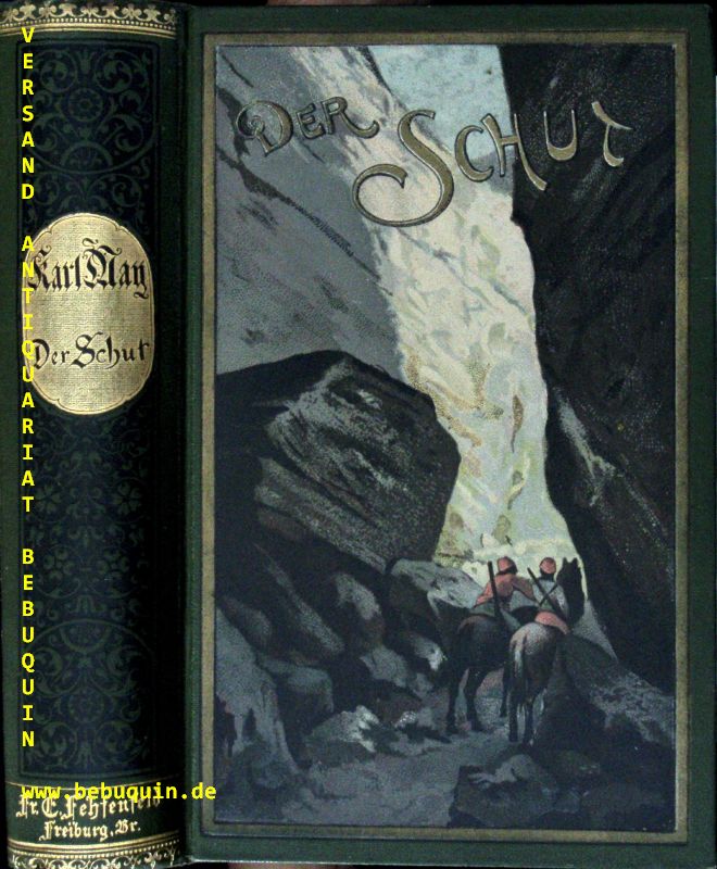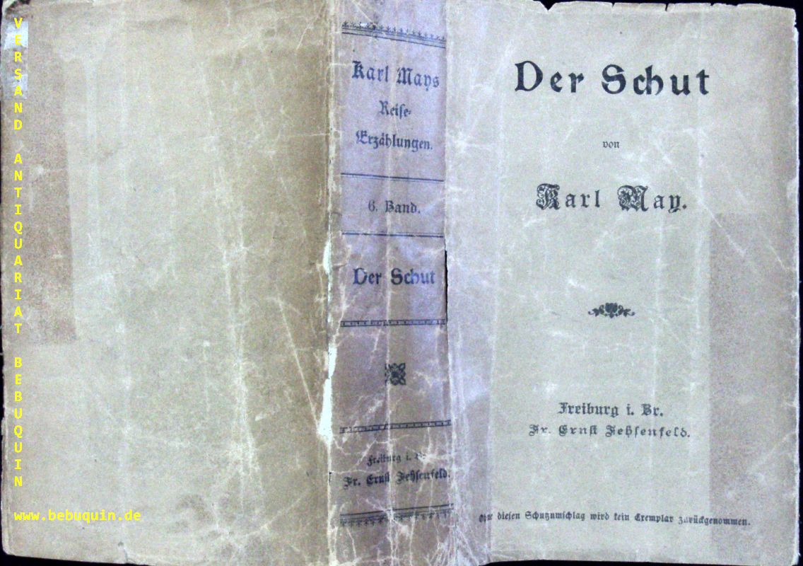 MAY, Karl: Der Schut. Reiseerzählung. 51.– 52. Tsd. Freiburg (Fehsenfeld), (1911). 645 S., 1 Bl. ill. OLn ( DB 50) mit OUmschl. Umschlag komplett hinterlegt, sonst tadelloses feines Ex. wie neu. = Gesammelte Reiseerzählungen, Bd. VI. sehr seltene Auflage. Plaul 238.10. Der Umschlag von durchaus musealem Charakter.