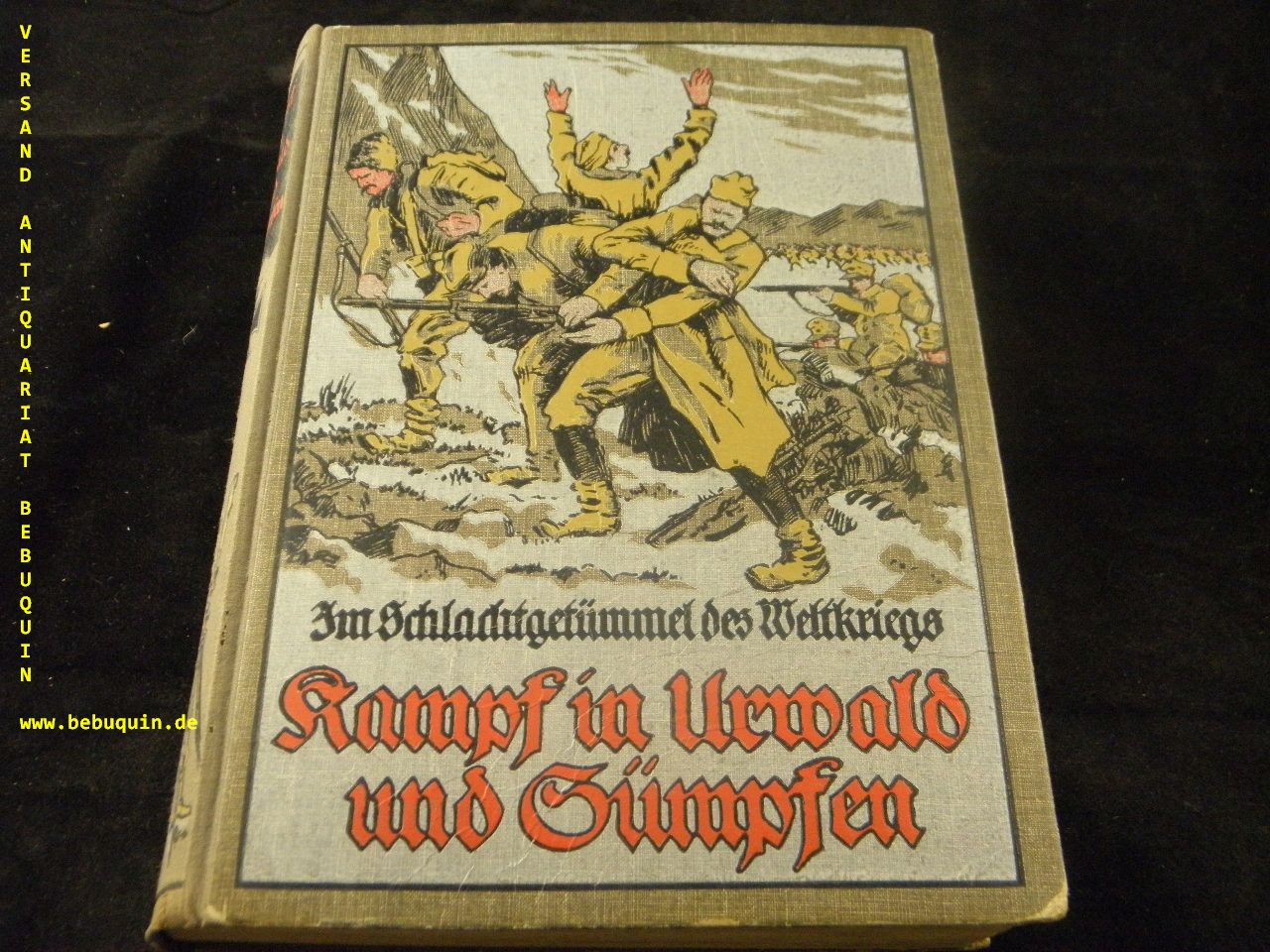 GELLERT, Georg: Kampf in Urwald und Sümpfen. Erzählung aus dem Völkerkriege 1914/16. Berlin (Jugendhorst), (1916). 221 (3) S. mit zahlr. farb. Bildtafeln. farb. ill. OHLn. Rückenkante mit Wurmfraß, sonst gutes Ex. = Im Schlachtengetümmel des Weltkriegs, Bd. 4. EA. 1839/23.
