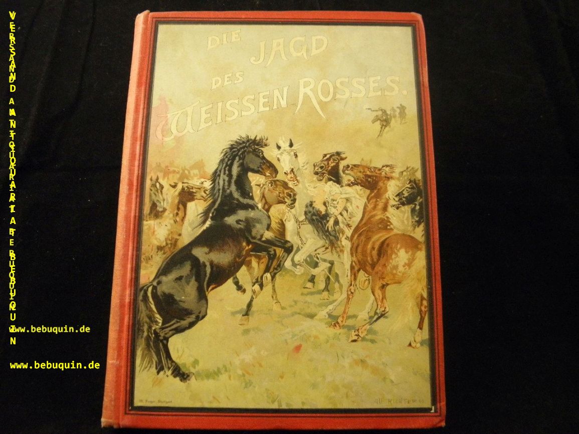 REID, Thomas Mayne: Die Jagd des weißen Rosses. Eine Erzählung für die Jugend frei bearb. von Otto Hoffmann. Stuttgart (Thienemann), (1892). Gr. 8°. 205 (3) S. mit 6 farb. Bildern von Albert Richter. OLn mit mont. Farbbild. Rückdeckel angeschmutzt, NaV, Ex libris, gutes Ex.