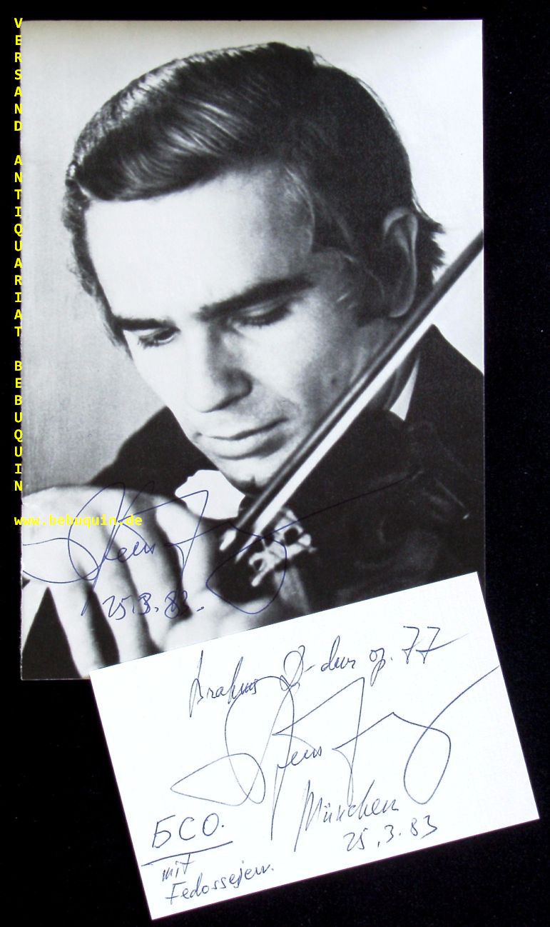 TRETJAKOW, Viktor (Dirigent, Violinist): eigenhändig signierte und datierte Portraitseite + eigenhändig signierte und datierte Autogrammkarte. München (Herkulessaal), 25.3.1983. 21 x 15 + 8 x 12,5 cm. 2 Bl. Wiktor Wiktorowitsch Tretjakow (* 17. Oktober 1946 in Krasnojarsk, Sibirien) ist ein russischer Violinist und Dirigent. (Wikipedia)