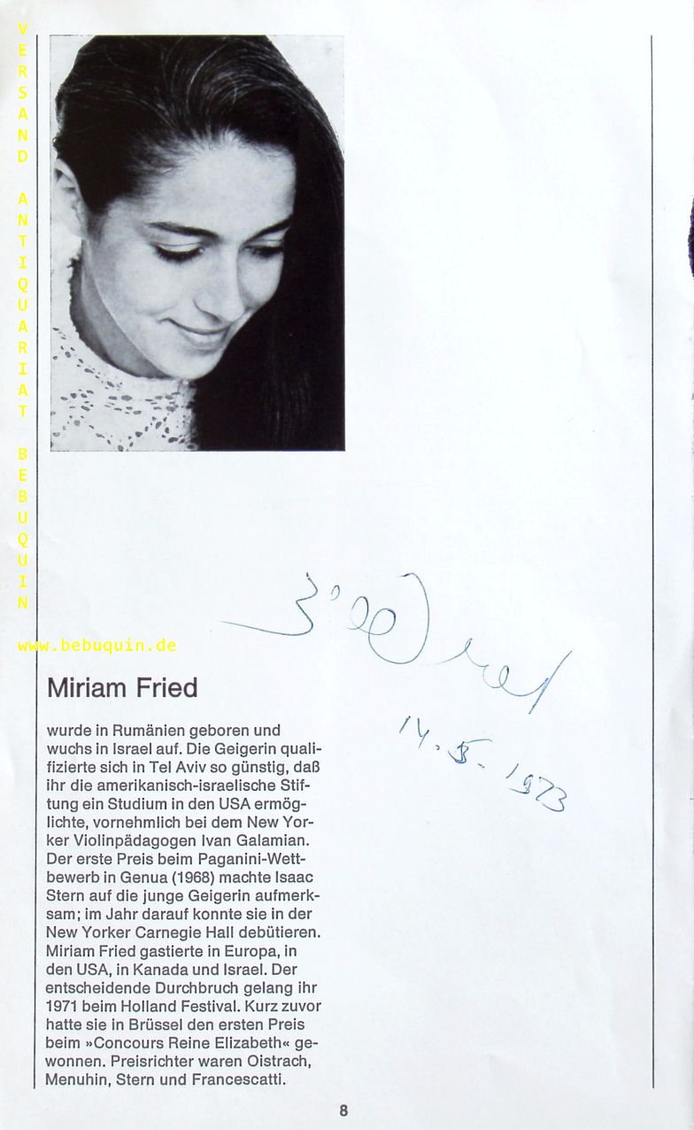 FRIED, Miriam (Pianist): eigenhändig signierte und datierte Portraitseite. München, 14.5.1973. 26 x 16 cm. 1 Bl. Miriam Fried (* 9. September 1946 in Satu Mare) ist eine israelische Violinistin und Musikpädagogin rumänischer Herkunft. (Wikipedia)