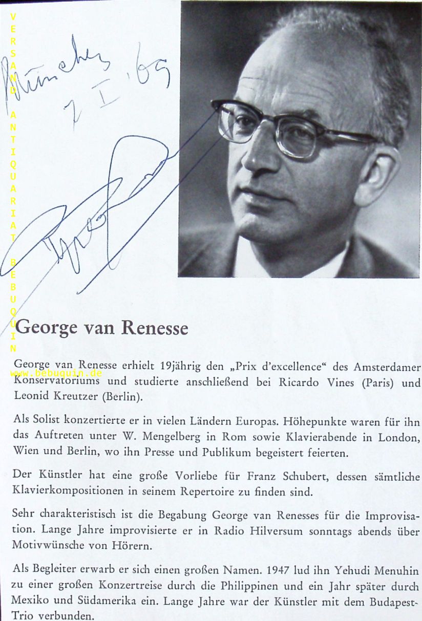 RENESSE, George van (Pianist): eigenhändig signierte und datierte Portraitseite. München (Herkulessaal), 7.1.1969. 18 x 12 cm. 1 Bl. George van Renesse (Zaamslag (Zeeuws-Vlaanderen), 21 februari 1909 – Bussum, 10 december 1994) was een Nederlands pianist, dirigent en muziekpedagoog. (Wikipedia)