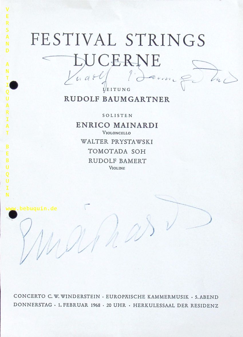 MAINARDI, Enrico (Cellist) + BAUMGARTNER, Rudolf (Dirigent): eigenhändig von beiden signierte Programmseite. München (Herkulessaaal), 1.2.1968. 21 x 15 cm. 1 Bl. seitlich gelocht.