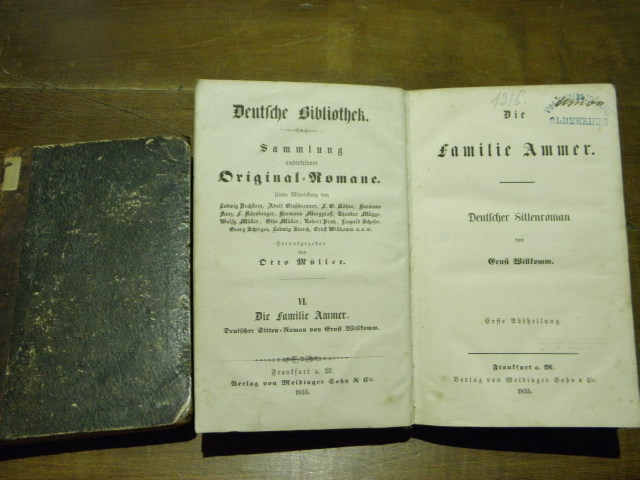 AMMER, Ernst Adolf: Die Familie Ammer. Deutscher Sittenroman. 3 Abtheilungen. 2 Bände. Frankfurt (Meidinger), 1855. 724 S. HLdr der Zeit. Kanten berieben, leicht schief gelesen, insgesamt gutes Ex. = Deutsche Bibliothek, Bd. VI. seltene EA WG² 25.