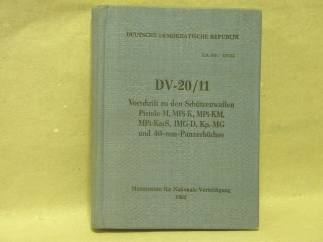 WAFFEN.– DV-20/11.– Vorschrift zu den Schützenwaffen Pistole-M, MPi-K, MPi-KmS, IMG-D, Kp.-MG und 40-mm-Panzerbüchse. Berlin (Ministerium für Nationale Verteidigung), 1963. kl. 8°. 328 S. mit ca 200 Abb. OLn. tadellos. seltene dt. EA. Inliegend die Ergänzung Nr. 2.