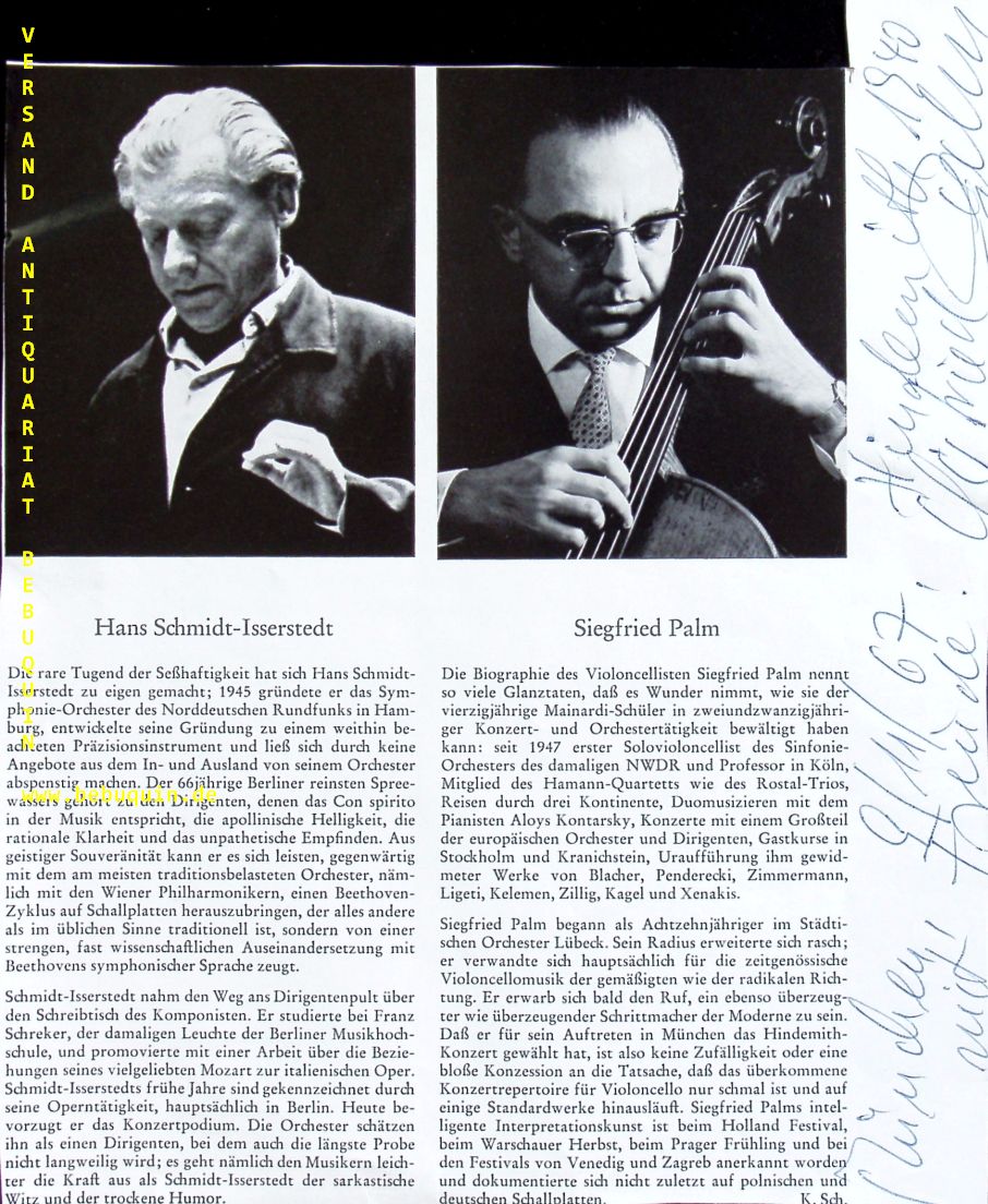 PALM, Siegfried (Cellist): eigenhändig signierte und datierte Portraitseite: Hindemith 1940 mit Freude. München (Philharmonie), 9.11.1967. 21 x 18 cm. 2 Bl. Siegfried Palm (* 25. April 1927 in Barmen, heute Wuppertal; † 6. Juni 2005 in Frechen) war ein deutscher Cellist, der besonders als Interpret zeitgenössischer Musik bekannt wurde, er regte Komponisten zu neuen Werken für sein Instrument an und verfasste selbst auch Lehrwerke wie Studien zum Spiel neuer Musik. Palm hat nicht unerheblichen Anteil daran, dass das Violoncello in der zeitgenössischen Musik zu einem der wichtigsten (Solo-)Instrumente avancierte. (Wikipedia)