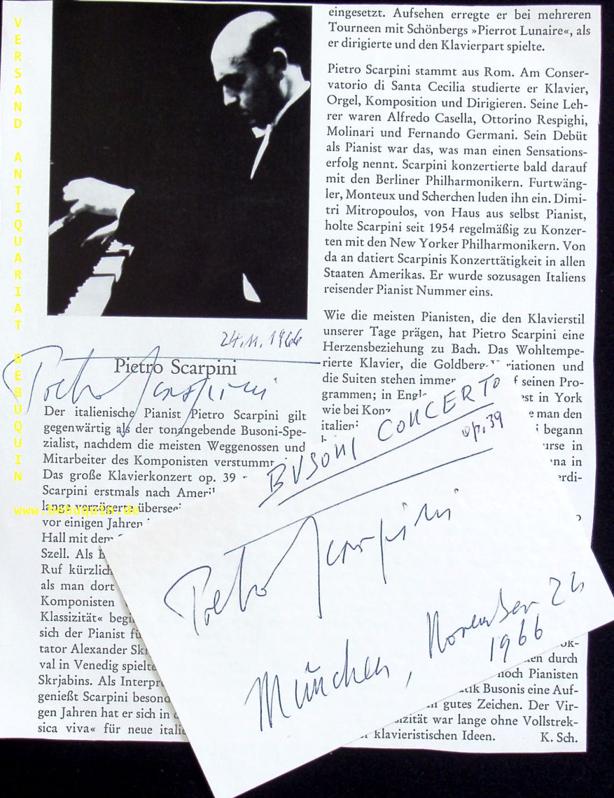 SCARPINI, Pietro (Pianist): eigenhändig signierte Portraitseite + eigenhändig signierte und datierte Autogrammkarte. München, 24.11.1966. 21 x 17 cm. 3 Blatt. Pietro Scarpini (* 6. April 1911 in Rom; † 27. November 1997 in Florenz) war ein italienischer Pianist, Komponist und Musikpädagoge. (Wikipedia)