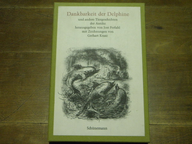 KRAATZ.– PERFAHL, Jost: (Hrsg.) Dankbarkeit der Delphine und andere Tiergeschichten der Antike. Bremen (Schünemann), 1970. 164,. 4 S. mit einer signierten und num. Orig.-Lithographie in Deckellasche, einem Frontispiz und 10 reproduzierten Tuschzeichnungen mit Feder und Pinsel auf Tafeln von Gerhart Kraaz. OPb in OSchuber. tadellos. Nr. 120 von 200 Ex. auf Bütten.