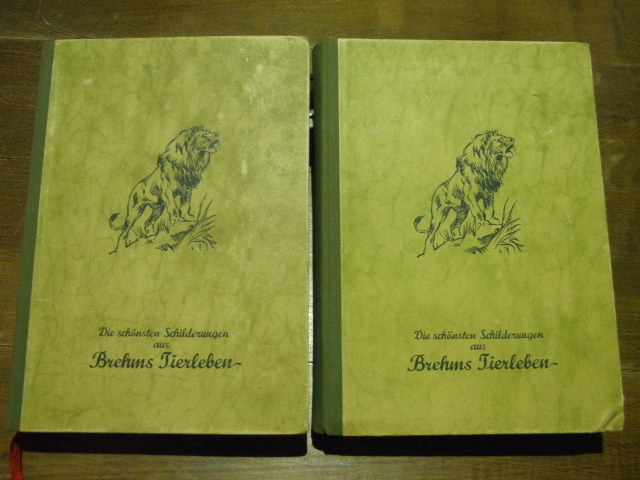 DUNKEL, Ulrich: (Bearb.) Die schönsten Schilderungen aus Brehms Tierleben. Neu überarbeitet und ergänzt von Ulrich Dunkel. Hefte 1 – 24 in zwei Bänden. Bad Pyrmont (Volksliteratur), 1952/53. 24 Hefte je 32 S. (durchnumeriert je 12 Hefte S. 1-384) mit farbigem Umschlag, Textillustr., meist einige Fotos auf Rücks. des Umschlages. ill. OHLn. Ecken gering bestoßen, gutes Ex. Komplette Folge der neubearb. Ausgabe nach der Vorkriegsserie in zum Teil geänderter Numerierung (vgl. Hethke, Romanpreiskatalog, S. 255). zusammen für